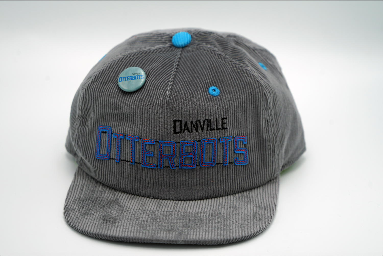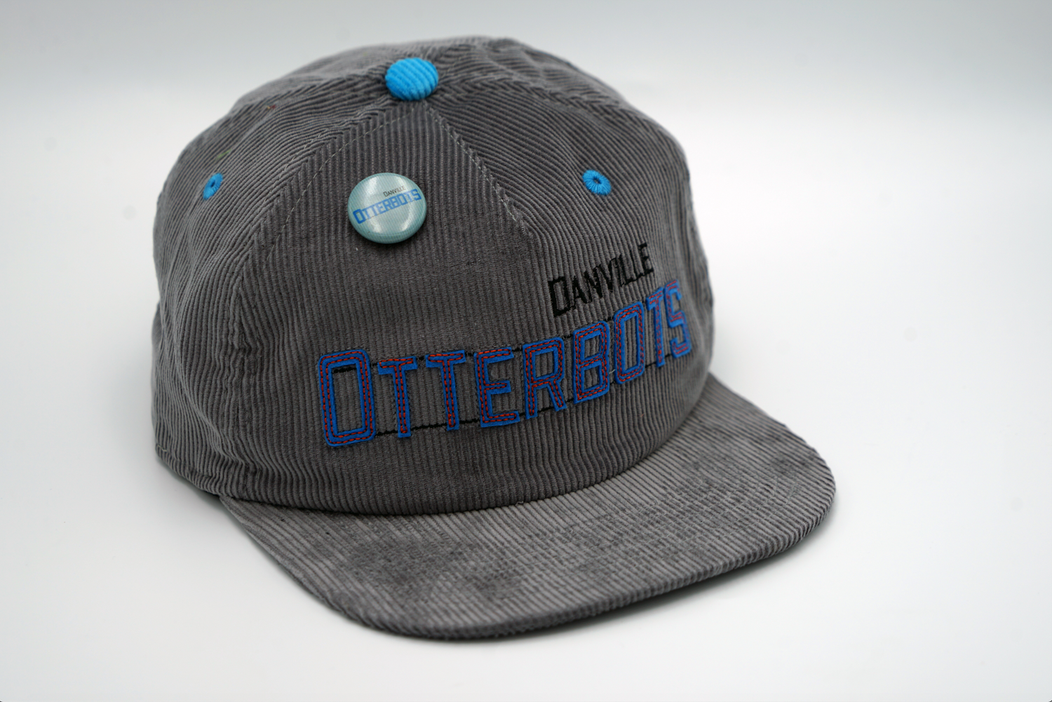 The Danville Otterbots partnered with [ official league ] on this limited-edition, high quality corduroy hat. The front lettering pays homage to the HOME OF DAN RIVER FABRICS sign that served as a Danville landmark, and the back features a stitched image of the Three Sisters smokestacks, a nod to Danville's past triumphs in textiles.