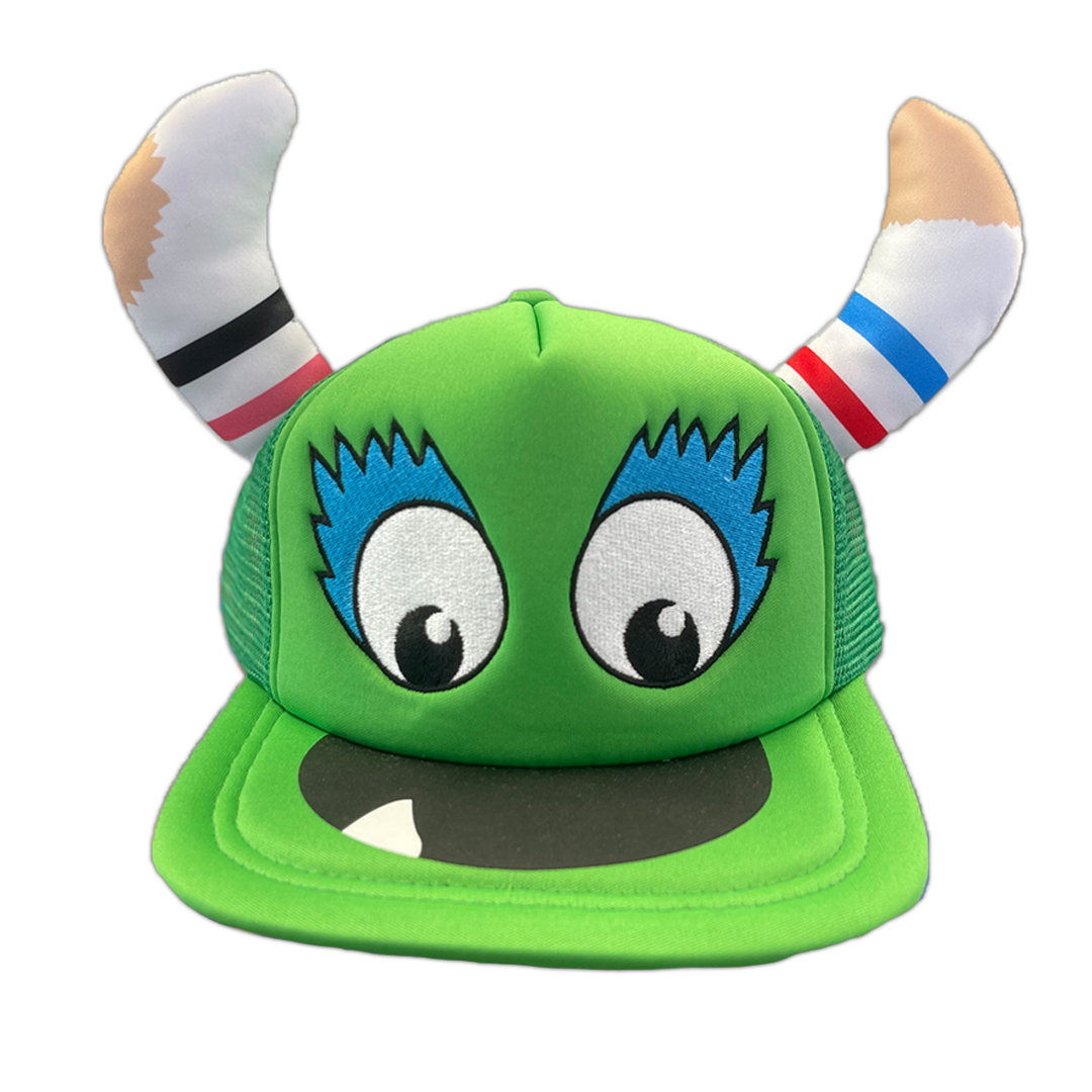 One of the best hats you could ever think of wearing; the Socksquatch Trucker Hat! The adjustable hat features our mascot, Socksquatch's sock-covered horns, his shiny tooth and heart-dropping eyes!