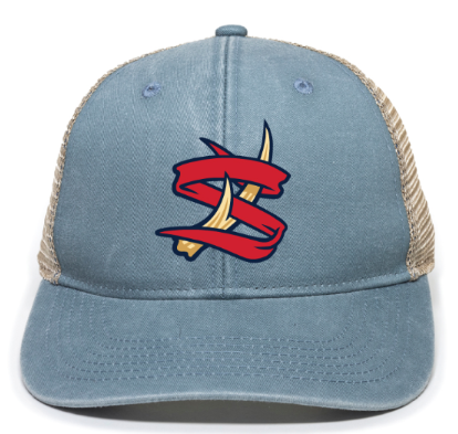 This coastal blue/tan ladies cap features the iconic Spikes 'S' logo and a mesh back design with a ponytail cut out. Keep your hair comfortably in place while showing your team spirit.
