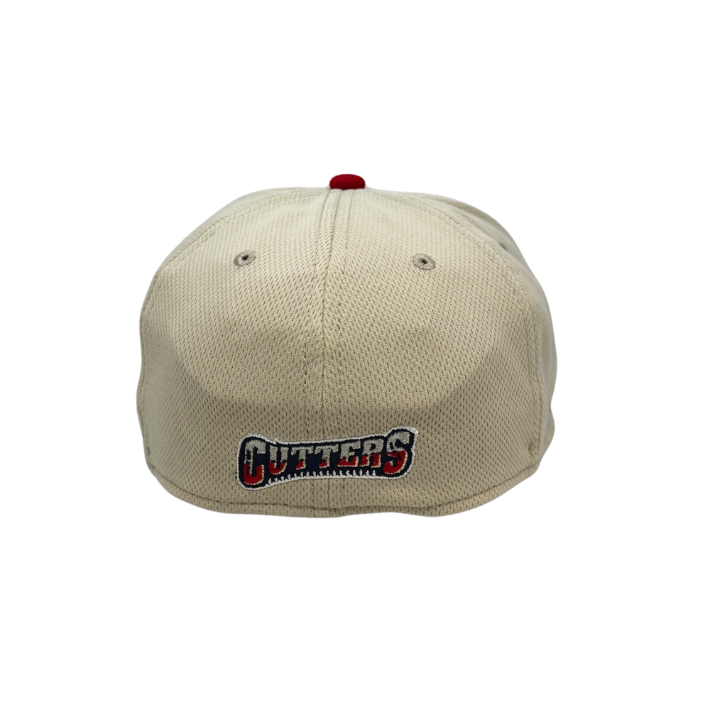 ProFlex style from OC Sport. Features stone colored crown and red visor, alternate logo on front with Cutters lettering logo on back.