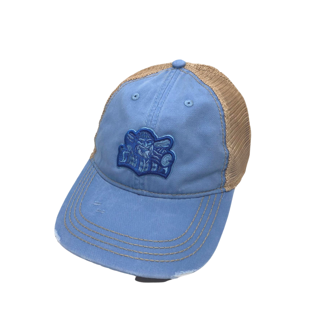 Ladies fit cap featuring distressed bill, mesh back and snapback closure.